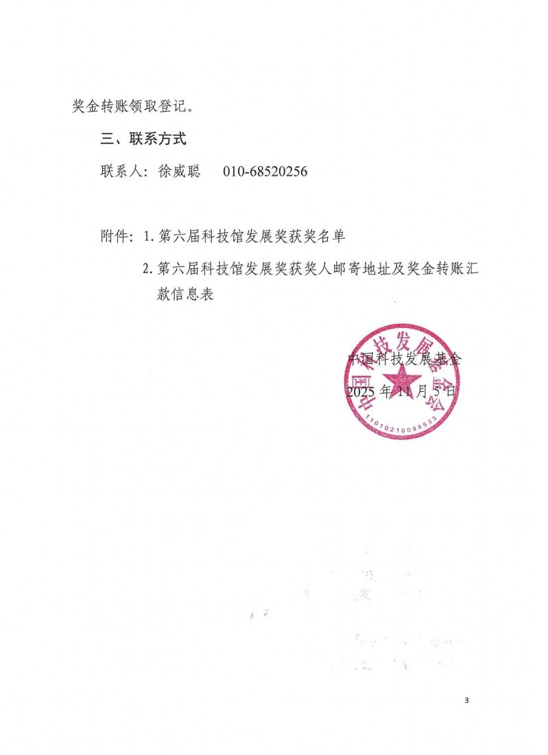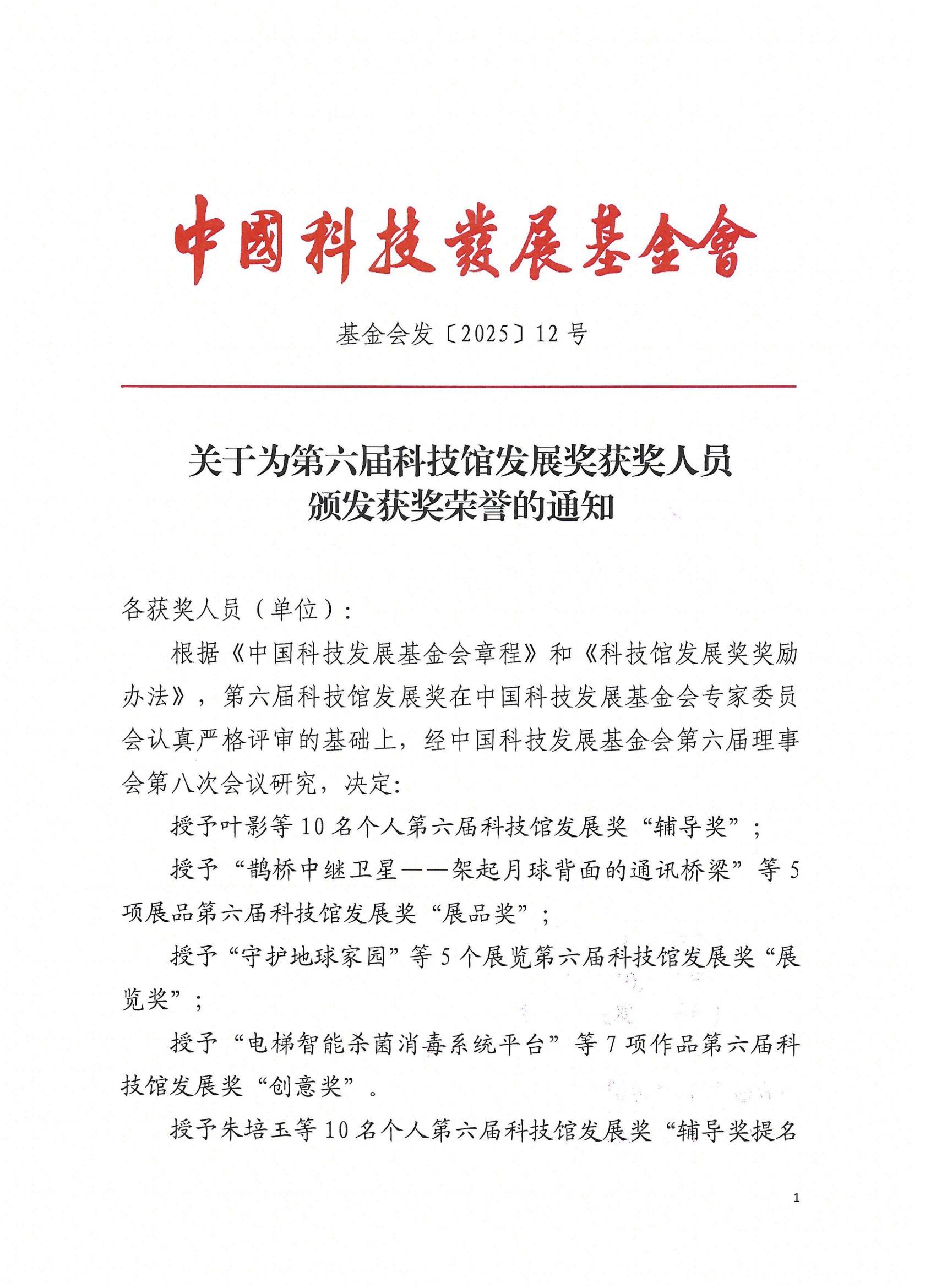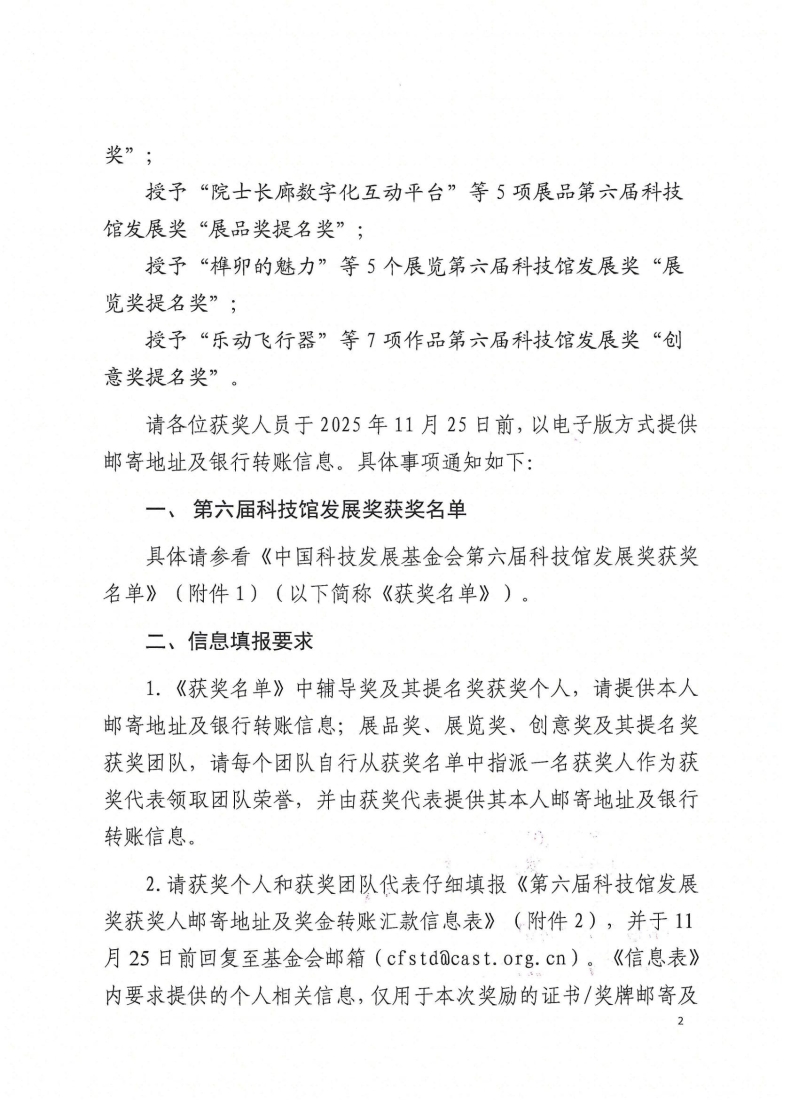 关于为第六届科技馆发展奖获奖人员颁发获奖荣誉的通知